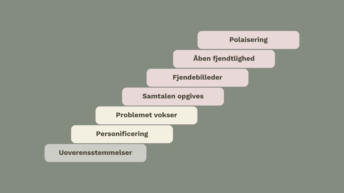 Modellen visualiserer, hvordan en konflikt kan optrappes, og hvilke faser en konflikt typisk gennemgår. Hvert trin repræsenterer en bestemt grad af intensitet, som en konflikt kan gennemgå – lige fra uoverensstemmelser til fjendebilleder og polarisering.